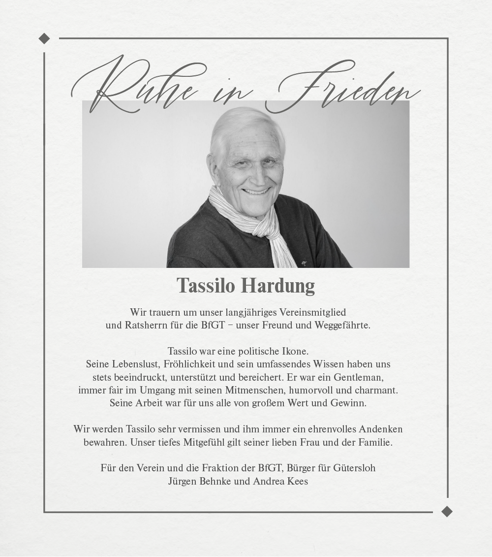 BfGT trauert um Tassilo Hardung Jürgen Behnke 28. Oktober 2025 28. Oktober 2025 Allgemein Wir trauern um Tassilo Hardung